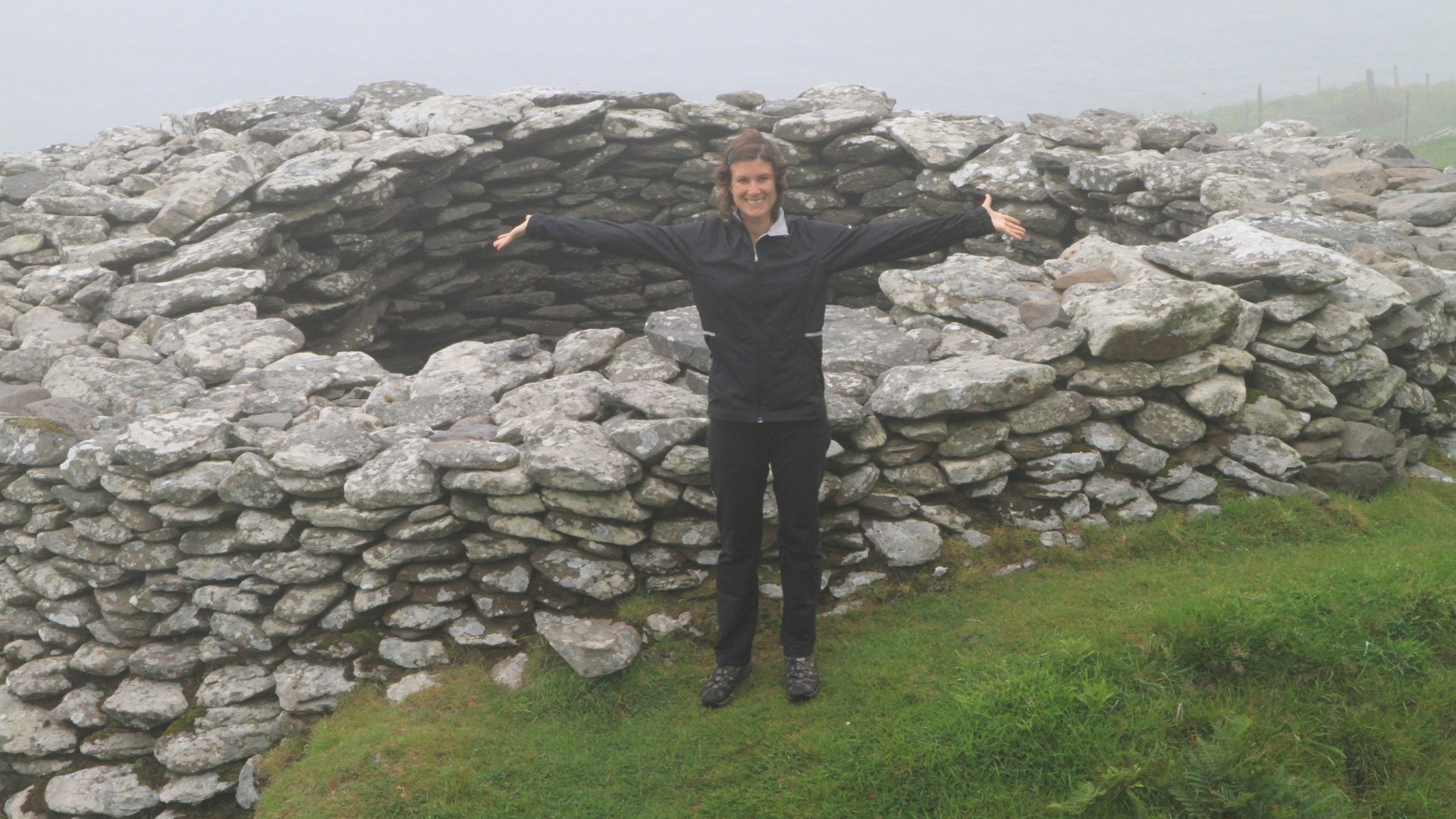 We found the house and parked. As we walked up her driveway, we saw the old women come out to collect her money and quickly realized this was the women in the movie Far and Away with Tom Cruise and Nicole Kidman. We paid her, and walked through her property being careful to avoid the sheep poop. The beehive huts were amazing little stone igloos…again made with individual stones stacked on top of each other and in a direction which kept rain from coming in. They were used as homes (tiny homes I may add) until about 1200 AD. Some no longer had their roof but many did. The doorways were tiny…I had to bend over to squeeze through so you can imagine Giff getting inside. It’s so amazing to think they built these little huts so long ago and without mortar between the rocks to make them stick yet they have survived all these generations. The fog was thick and settling around us as we walked through the area…it was really special to be able to see these in person.