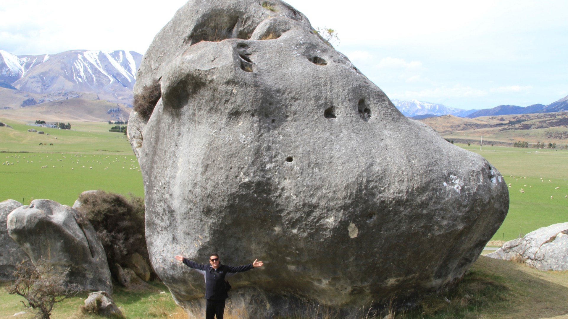 After getting out of the airport area, we found ourselves in the countryside. There were cows and sheep grazing on the fields of green grass and white top mountains in the distance. After driving for about an hour, we came to our first stop…amongst the hills and between the mountains were huge limestone boulder formations throughout the valley. It was called Kura Tawhiti and is open to the public for exploring. We got out of the car and walked around, taking pictures to show how massive the boulders were in comparison to ourselves. It looked like a scene straight out of Lord of The Rings. Giff decided to sprinkle some of his dad’s ashes there as well…it was a beautiful and serene landscape.